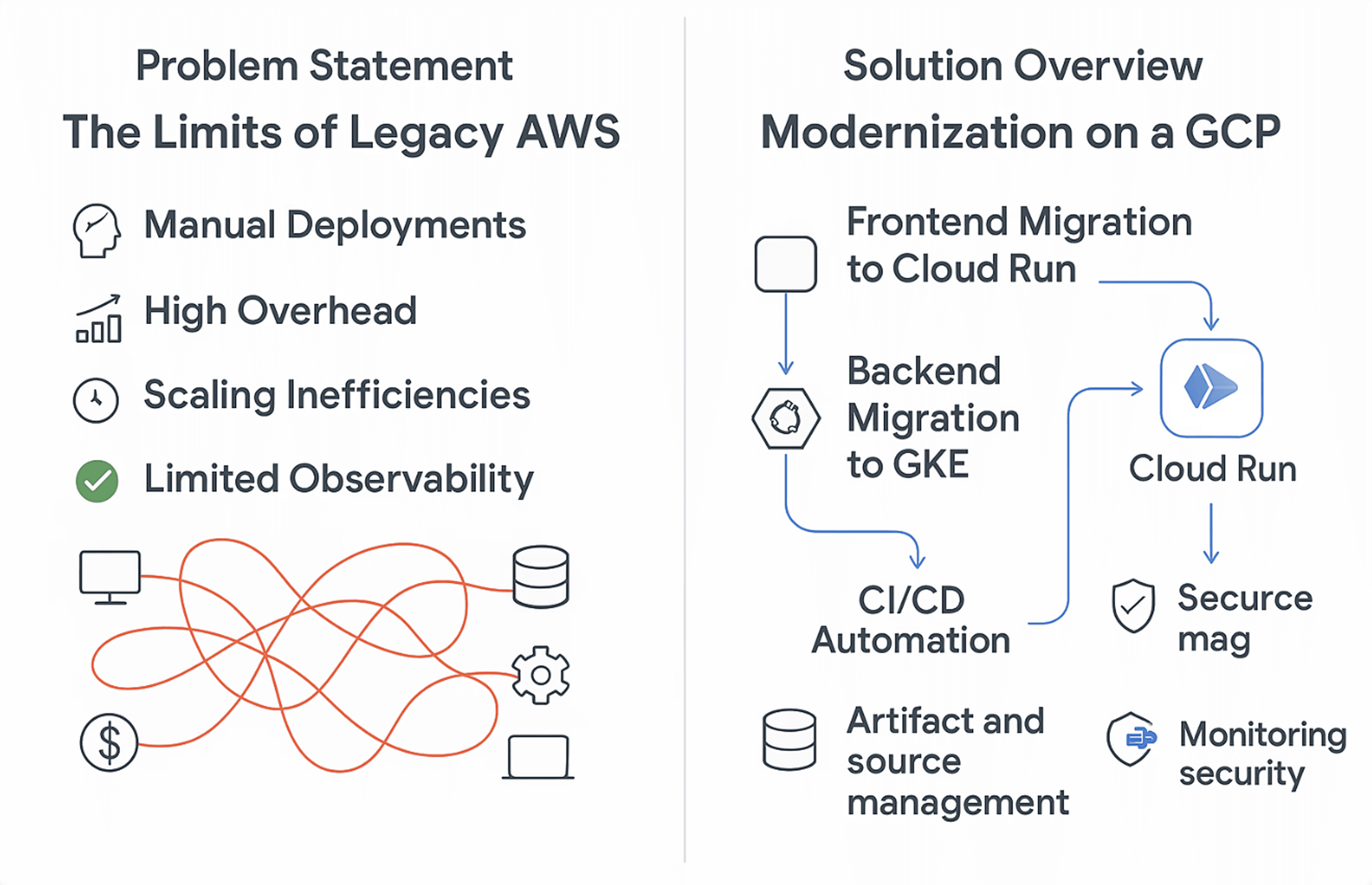 The Goal: Modernize the infrastructure by migrating to key GCP services, dramatically improving automation, enhancing scalability, and reducing overall costs.